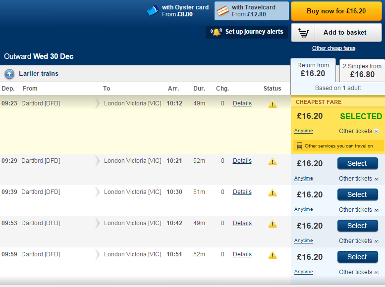 You will notice that the (well-hidden) “warning” does not appear on the incorrect fares for Tuesday 12 January – see http://ojp.nationalrail.co.uk/service/timesandfares/SEV/London/120116/0915/dep/120116/1400/dep – and does not appear on the incorrect fares for the trains today unaffected by the London Bridge work (for instance the xx00 and xx30 Thameslink services to Blackfriars). It may be that National Rail Enquiries think that the problem only affects the special timetable – it doesn’t