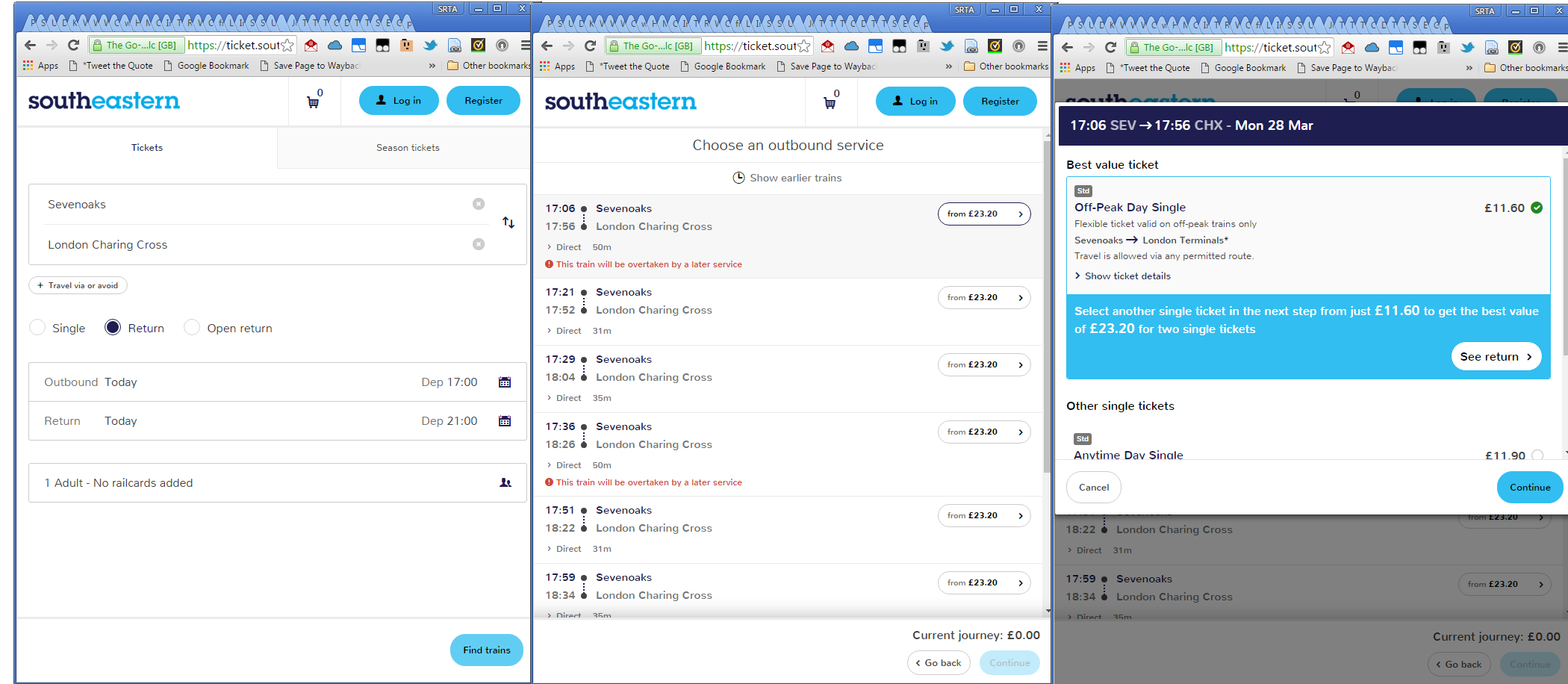 In the meantime we would suggest not buying the ticket through the Southeastern website unless you are sure what the correct fare should be and you can get it to offer it to you. Some other websites do better and you can still pick the ticket up at Sevenoaks. For instance the Chiltern Railways site (which seems to use the same system as Southeastern used to use):
