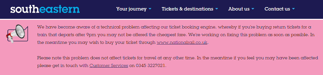 - if there is a known bug in the website then customers should be warned before they buy a ticket. For Southeastern not to do so means that they are knowingly overcharging their customers. Not taking immediate action to warn customers (or perhaps taking the site down completely) is unacceptable.