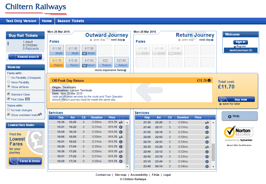 Update 1000 29 March 2016: The mis-selling of tickets is continuing – and it applies to off-peak day return journeys from Tonbridge and from Maidstone East as well as from Sevenoaks. It occurs if the return journey time is specified as 2100 or later. In fact, if you continue with the transaction, the “return” single is dated for the next day – so it is not even valid for the train that you specified!