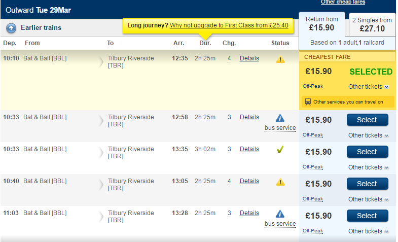 I recently made an enquiry on the National Rail Enquiries Website for the recommended journey from Bat & Ball to Tilbury Riverside. I expected to be advised to travel to either London Bridge or Cannon Street via Sevenoaks then transfer to Fenchurch Street and travel to Tilbury Town by c2c and change there on to the bus service to Tilbury Riverside.